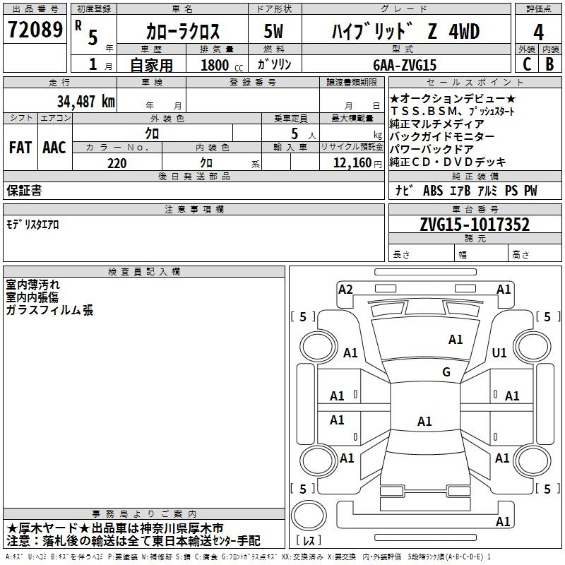 Еще фото Написать в Whatsapp Online Написать в Telegram Мы открыты Позвонить Мы открыты MIRIVE Saitama Аукцион 15038 Лот В корзину TOYOTA COROLLA CROSS ZVG15 Год: 2023 Объём: 1800 сс КПП: FAT Пробег: 31 000 км Привод: FULLTIME4WD Комплект.: AAC Мощность: 98 л.с. Цвет: Black Год: 2023 Объём: 1800 сс КПП: FAT Пробег: 31 000 км 1 300 000 ¥ Стартовая цена 2 201 000 ¥ Средняя цена