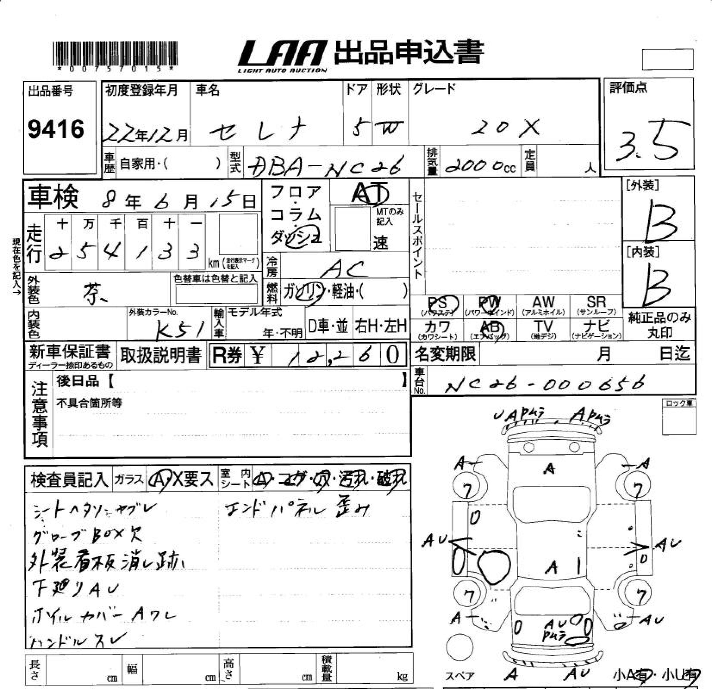 Еще фото Написать в Whatsapp Online Написать в Telegram Мы открыты Позвонить Мы открыты NAA Tokyo Аукцион 5834 Лот Sold Статус В корзину NISSAN SERENA NC26 Год: 2013 Объём: 2000 сс КПП: IAT Пробег: 155 000 км Привод: FULLTIME4WD Комплект.: AAC Мощность: 144 л.с. Цвет: Год: 2013 Объём: 2000 сс КПП: IAT Пробег: 155 000 км 1 504 677 ₽ Цена под Ключ Составляющие цены