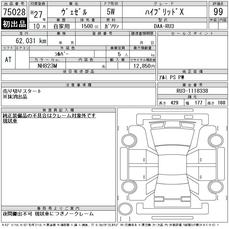 HONDA VEZEL Серый 1500 см3 2015 год