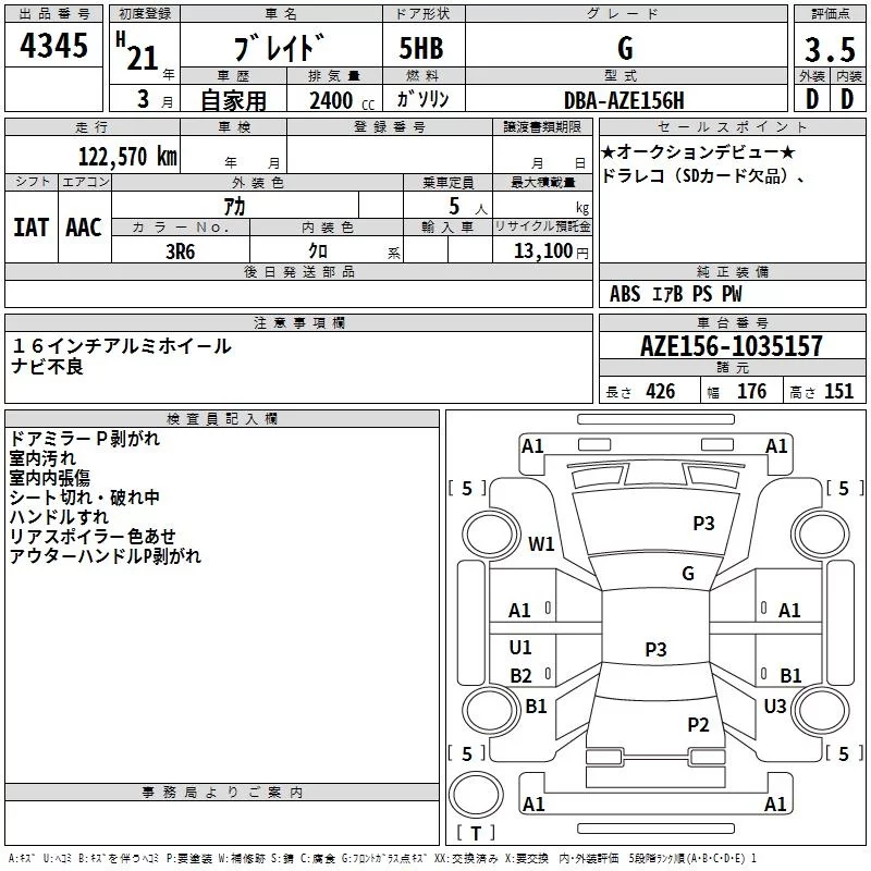 TOYOTA BLADE Красный 2400 см3 2009 год