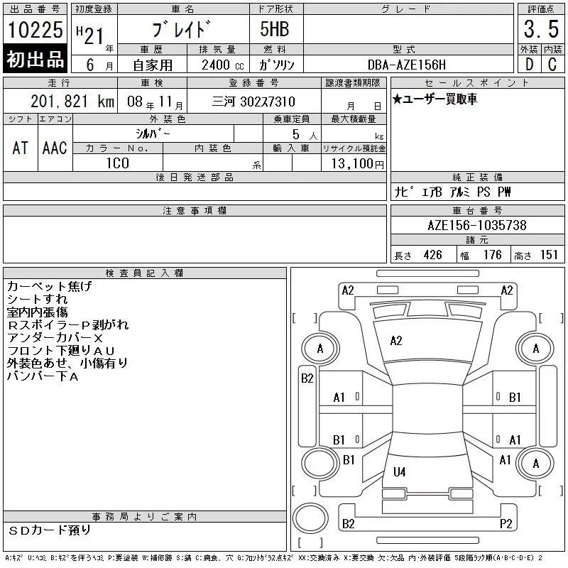 TOYOTA BLADE Серый 2400 см3 2009 год